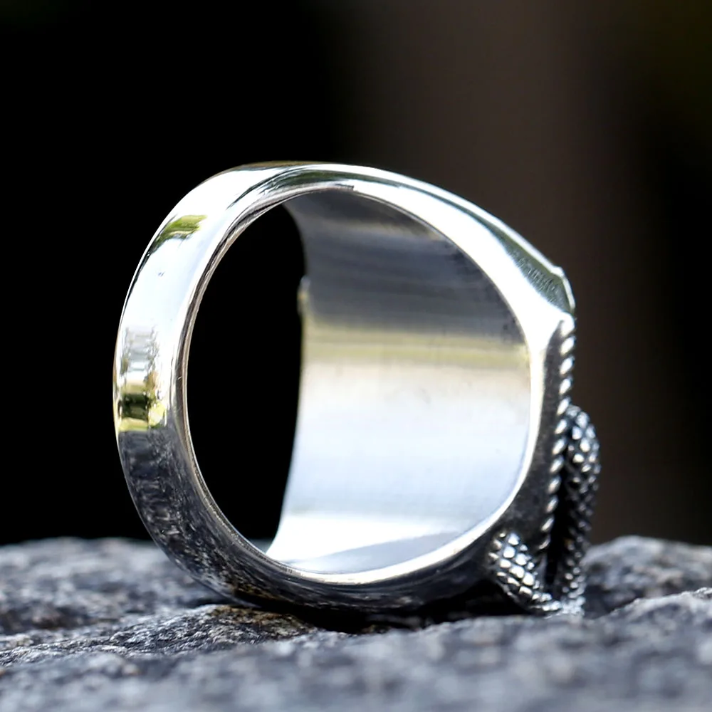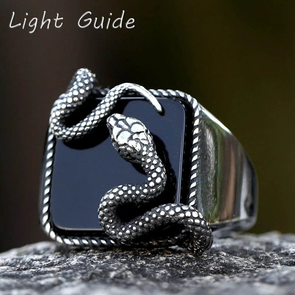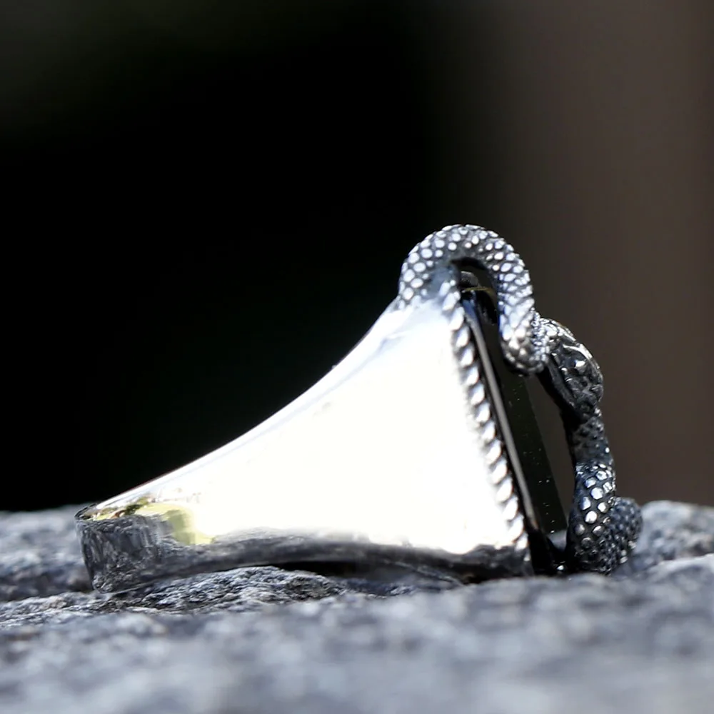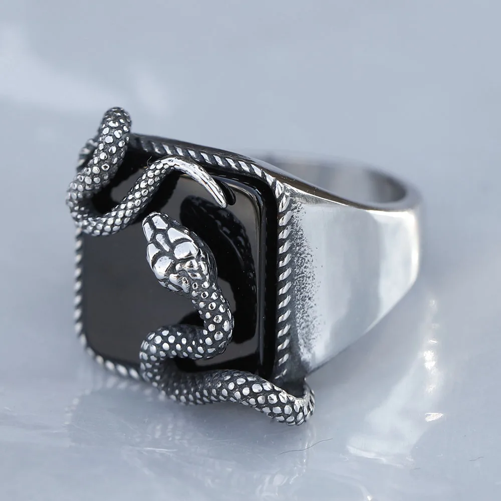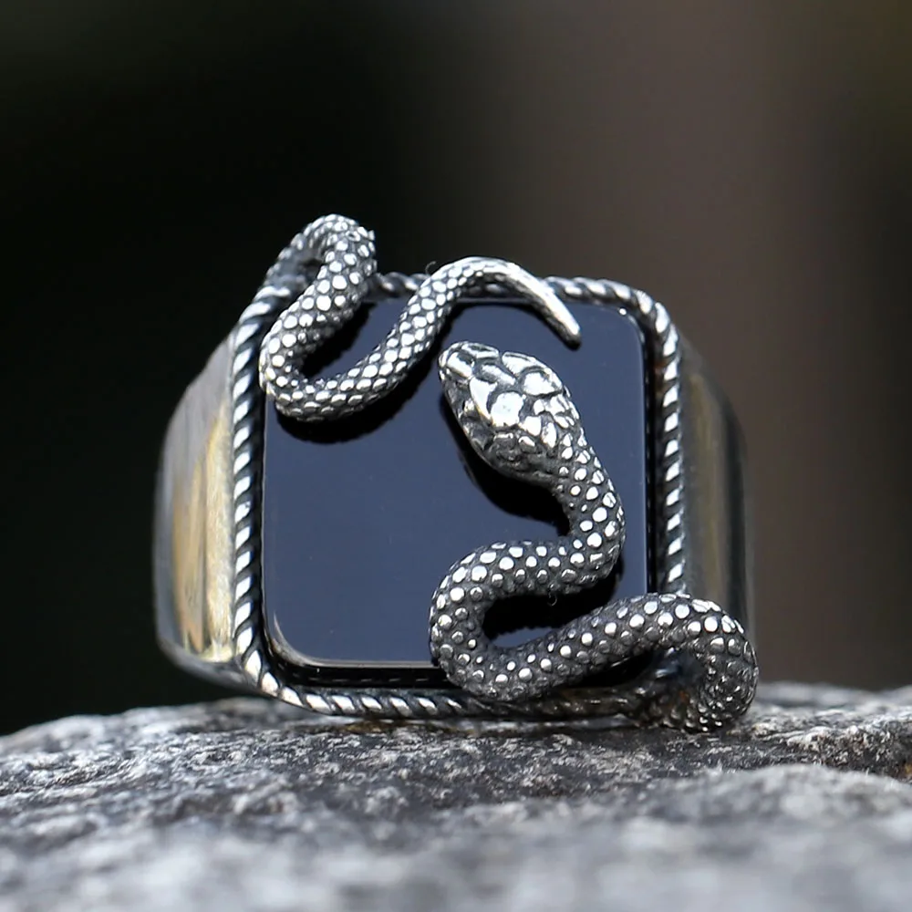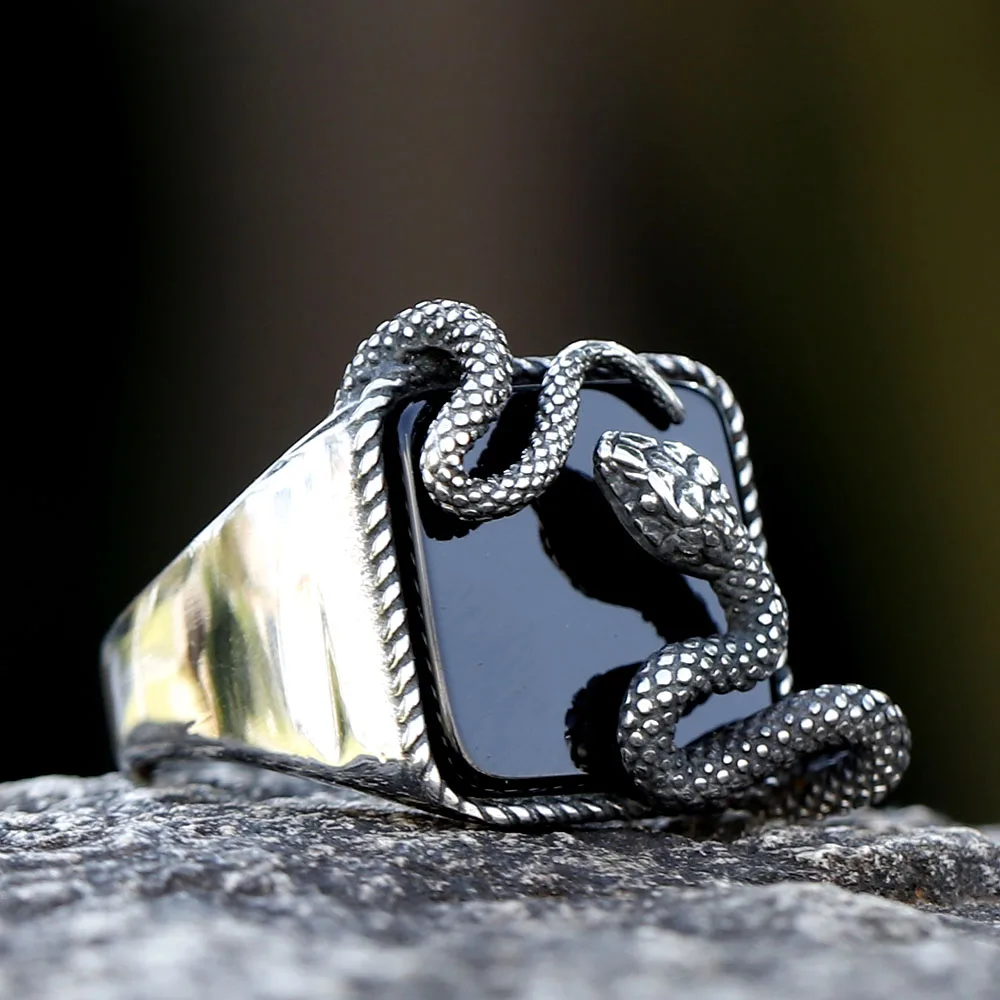 Men's Punk Rock Black Stone Ring With 3D Snake Gothic Style 316L Stainless Steel Biker
