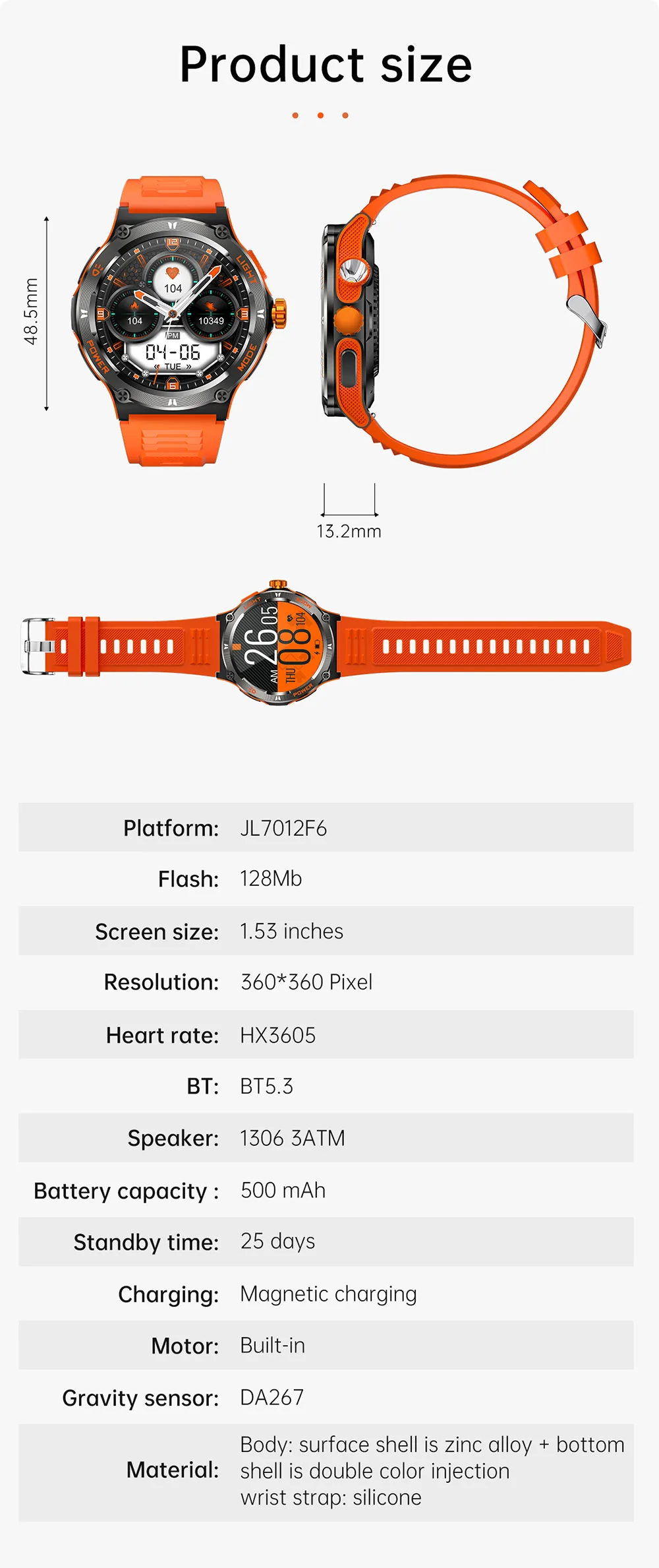 Main functions: Outdoor light, compass, 1.53 inch ultra HD screen 360*360 pixels, full screen touch, heart rate, blood oxygen, blood pressure, pressure, exercise recording (steps, distance, calorie count), exercise mode, voice assistant, message push, information storage, sleep monitoring, weather push, stopwatch, timer, stopwatch, calculator, World clock, camera remote control, Music control, find your phone, women's health, etc.