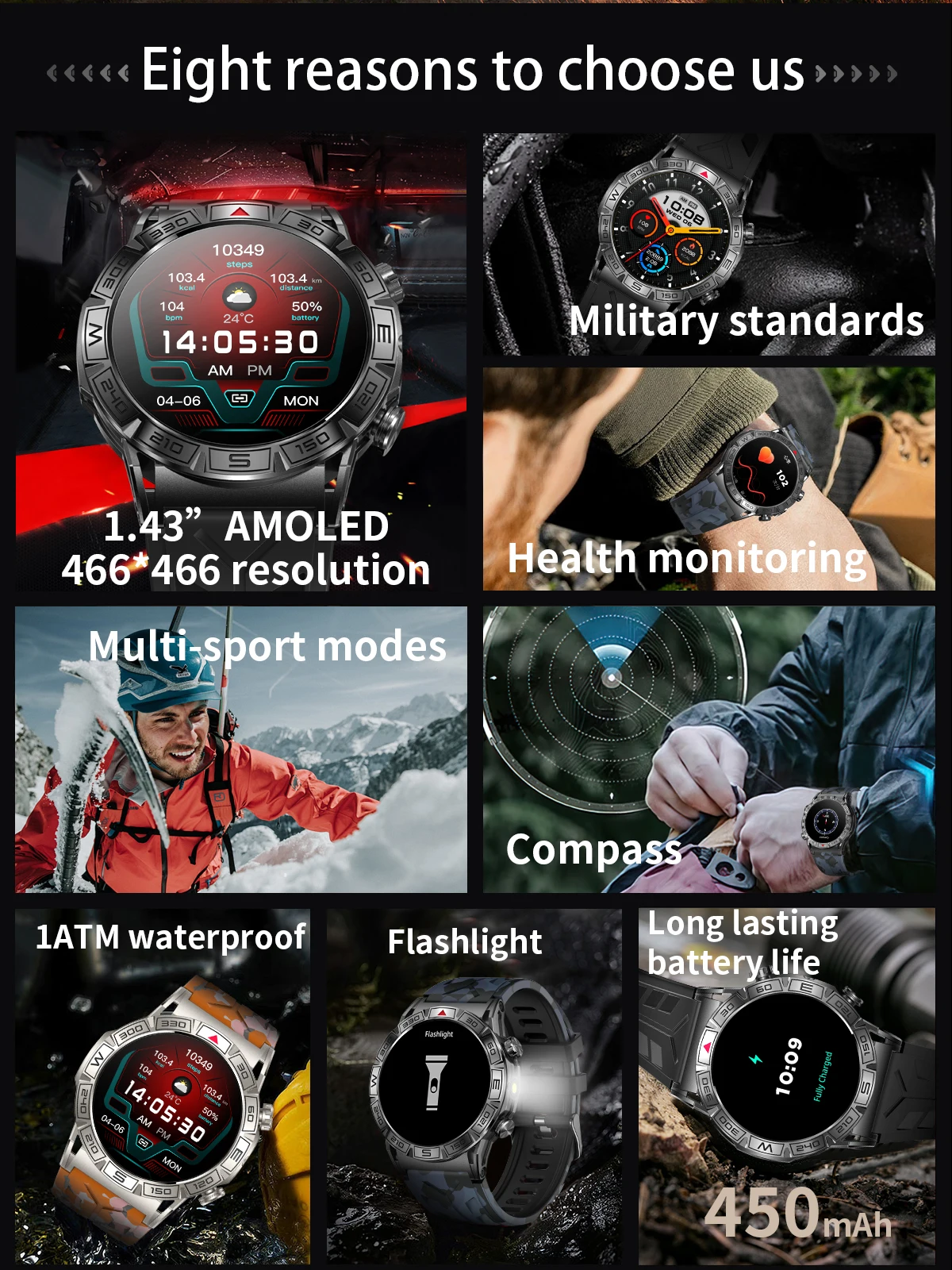 1.43-inch high-definition large screen smartwatch: This new military smartwatch features a brand new design, a 1.43-inch AMOLED touch screen, full view, 466 * 466 resolution, and looks brighter, clearer, and more textured.