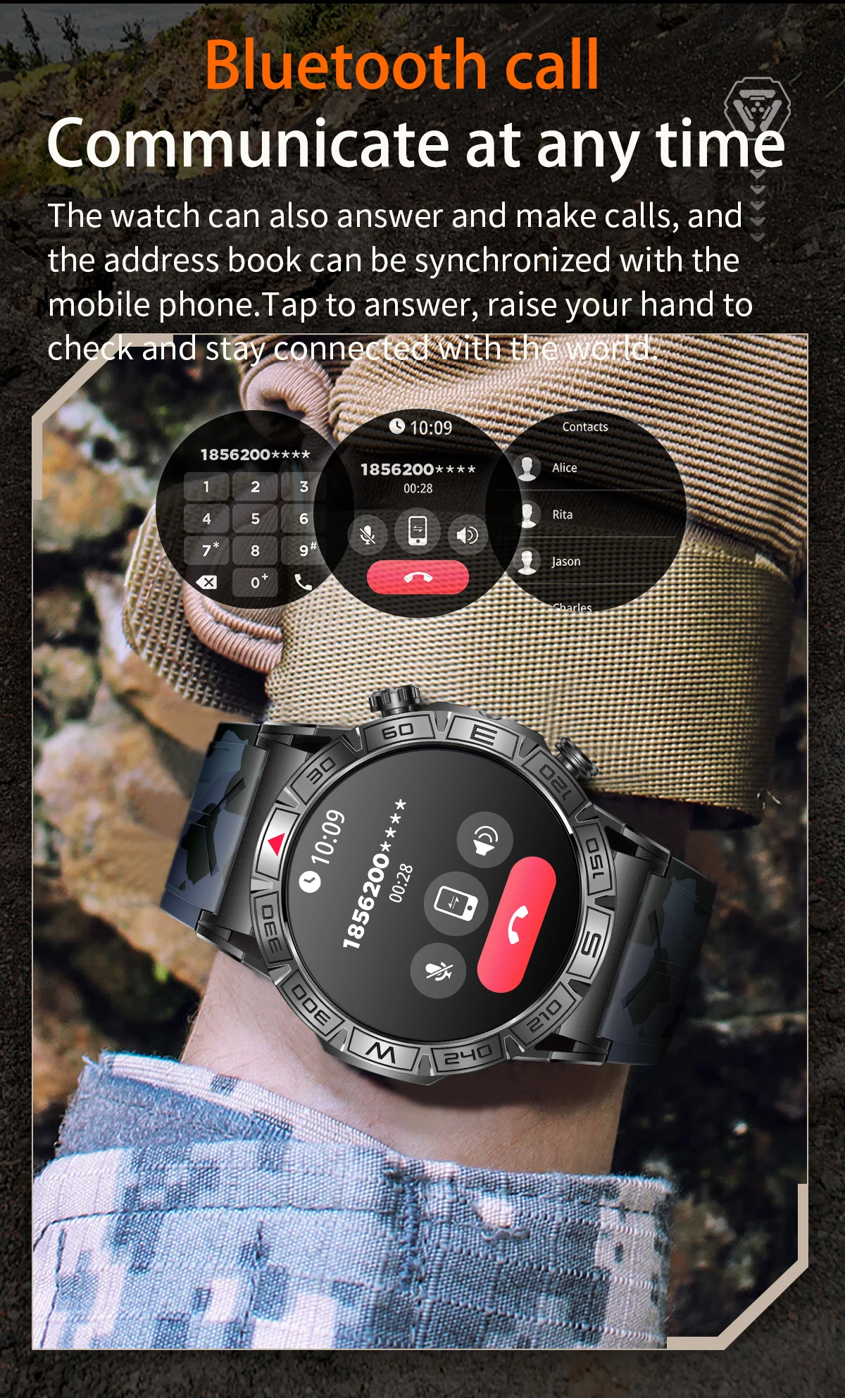 Outdoor durable smartwatch: Military smartwatches have passed multiple standard tests. Temperature resistant, waterproof, corrosion-resistant, dustproof, shockproof, etc., suitable for complex and ever-changing outdoor environments. It is the best companion for outdoor, sports, and camping.