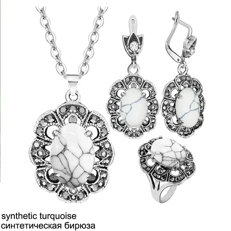 Antique Silver-Plated Vintage Floral Quartz Opal Jewelry Set