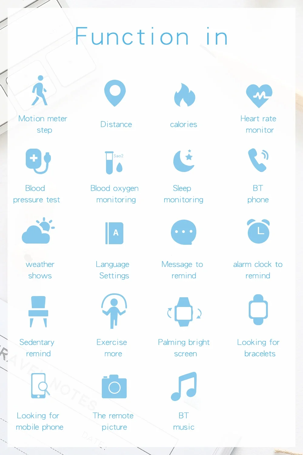 Bluetooth call,Custom Wallpaper,drinking reminder, blood oxygen, sports mode (outdoor running, walking, mountaineering, indoor running), Facebook, twwiter, WhatAPP, calendar,message reminder,heart rate, sleep monitoring, Bluetooth music, SMS, call record, SIRI/Voice Assistant,alarm clock, remote photo, step counting, blood pressure, address book, looking for mobile phone, et.