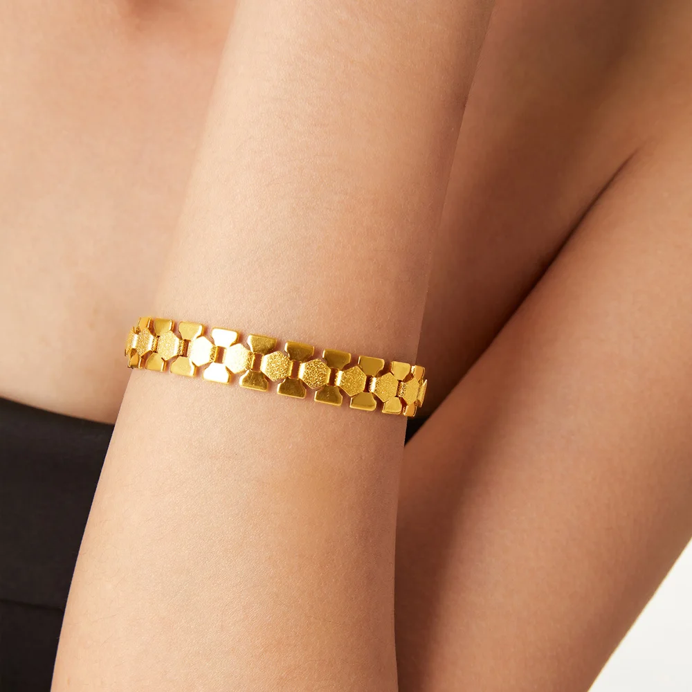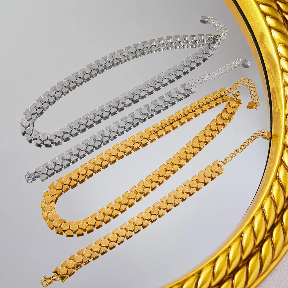 The geometric pattern is pretty much a vibe check; bold yet minimalistic, it whispers confidence without even trying. The stainless-steel glow will keep you shining in any crowd, making people wonder if your sense of style comes with its own Spotify playlist. And the best part? This jewelry set comes with a dual-benefit ethos, serving both the neck and wrist game like the best multitasking queen in the house.