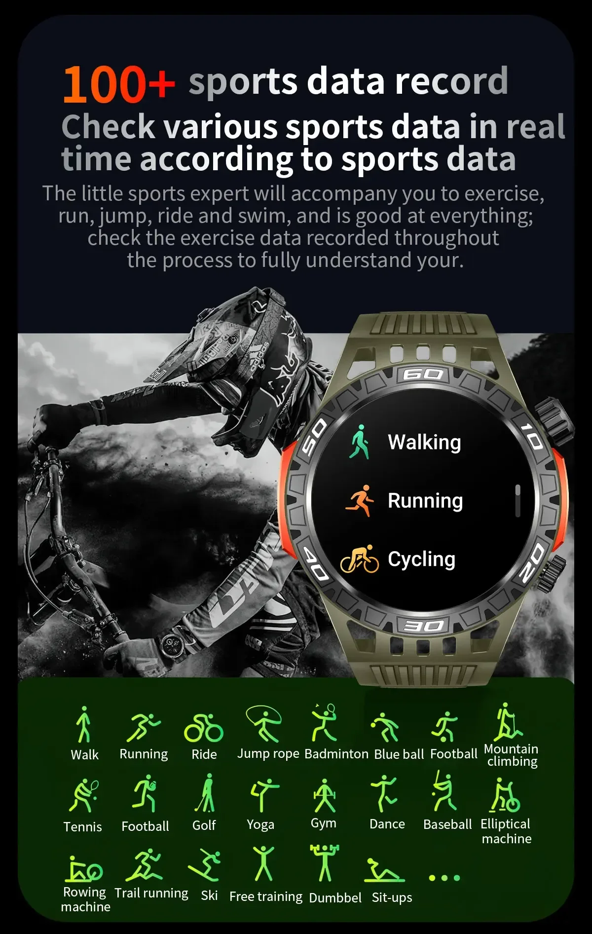 • Sport mode: 9 movement modes at the watch end, mass movement mode at the APP end