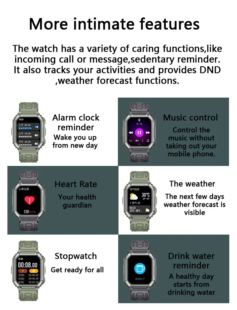 Other functions: raise the hand to brighten the screen, turn the wrist to brighten the screen, alarm reminder, vibration reminder, stopwatch, countdown, music control, remote photo, weather, screen brightness adjustment, APP movement track, APP dial market, customized dials, calculators, etc.