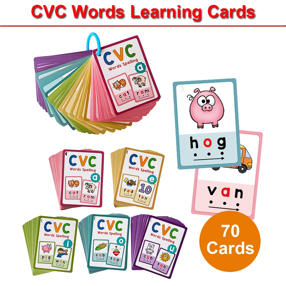 Montessori CVC Words Flashcards Short Vowel Reading Letters Sorting Spelling Word English Cards CVC Beginning Phonics Word Builders Toddler Learning Toys 130 Words, 70 Cards