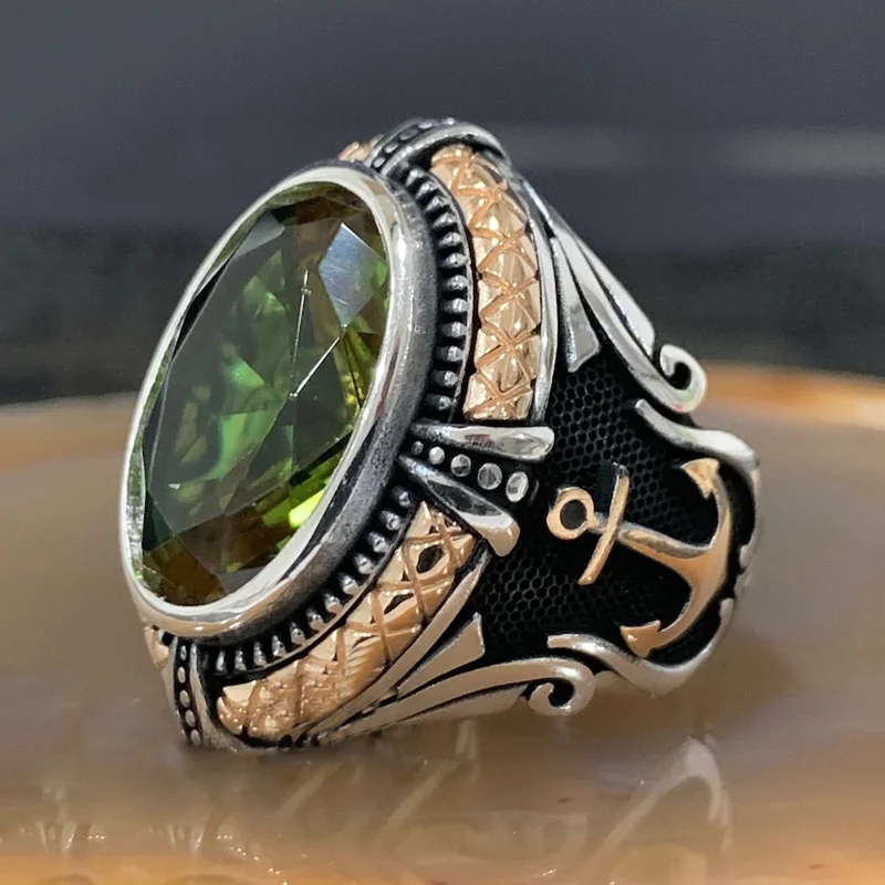 Vintage Green Crystal Gothic Mens Ring with Anchor Design